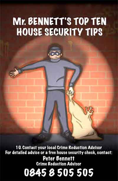 1. Fit door locks 2. Check door standards 3. Fit window locks and check window standards 4. Lock UPVC doors 5. Use burglar alarms 6. Lock side gates 7. Deter burglars 8. Secure tools 9. Use security lights |