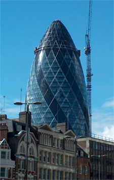 Commonly known as the Gherkin....... A new sky-scraper, nicknamed the erotic gherkin, is to be built in the City of London following a decision by John Prescott. The deputy prime minister decided the planning application for the tower, to be built on the site of the Baltic Exchange, did not need further consideration. The 41-storey high, round, tapered building, was designed by Lord Foster. It will be the second tallest structure in the City, after the NatWest tower - now named Tower 42. But Canary Wharf will remain the highest building on the London skyline. The construction will involve the levelling of the old Baltic Exchange building which was severely damaged by an IRA bomb in 1992. SO here it is at last, the Great Gherkin of London, rising as of last week to its full height, ready to take its place alongside the Eye and St Paul's as a legendary landmark of this great city. Designed by Norman Foster and his partners, it is impossible to miss, with its bulk fast being gift-wrapped in jazzy glass, and its "topping out" celebrated with a lurid light show of green and purple.. Its there, it is likely to stay, which is why this and other proposed towers have been agonisingly and expensively argued over by planners, architects, heritage experts and lawyers for the past six years, ever since a far larger tower was proposed. The site was reviously occuppied by the Baltic Exchange which for those of us who can remember this builing was unique in many respects and a great loss. There is no doubt that the London is going up in a big way, the new designs, new technologies and a ready acceptance of high buildings of quality design will push the town up and its reputation as a world city upward. The Skyline of the City